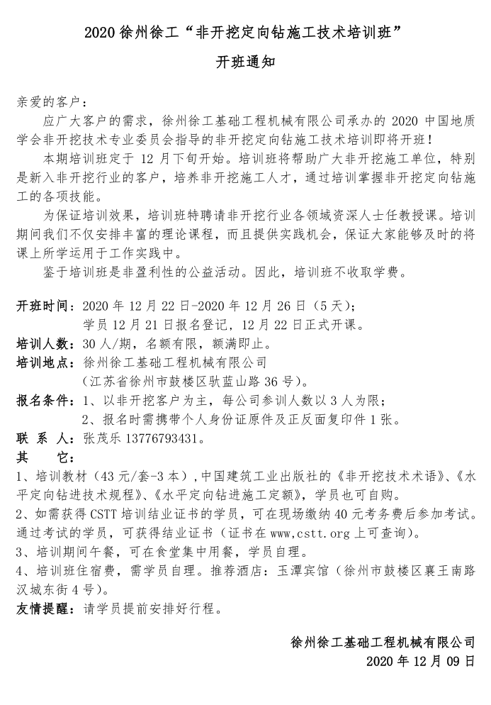 2020徐州徐工“非開挖定向鉆施工技術(shù)培訓(xùn)班”開班通知 2020-12-10