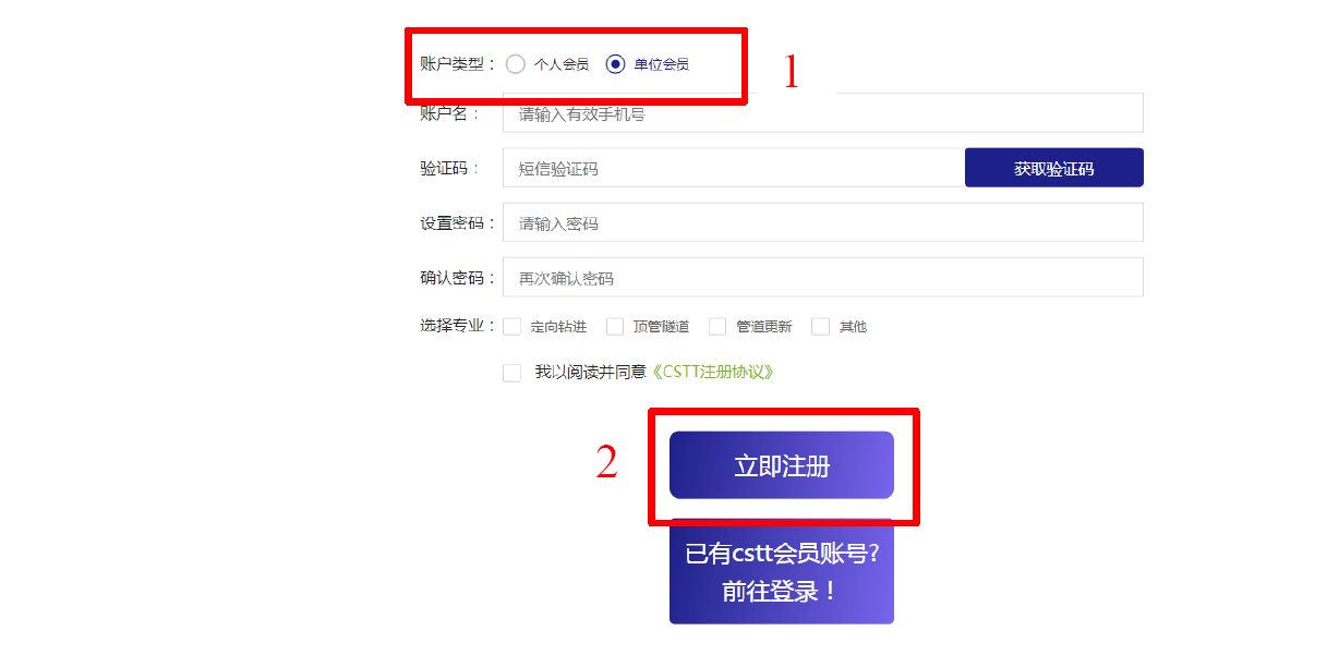 第二步:如果是首次登陸,請在賬戶類型處選擇“單位會員”,然后“立即注冊”。如果已有賬號,請選擇已有CSTT會員賬號?前往登錄。此處登錄賬號為已經在CSTT官網注冊成功的單位會員的賬號(手機號)。