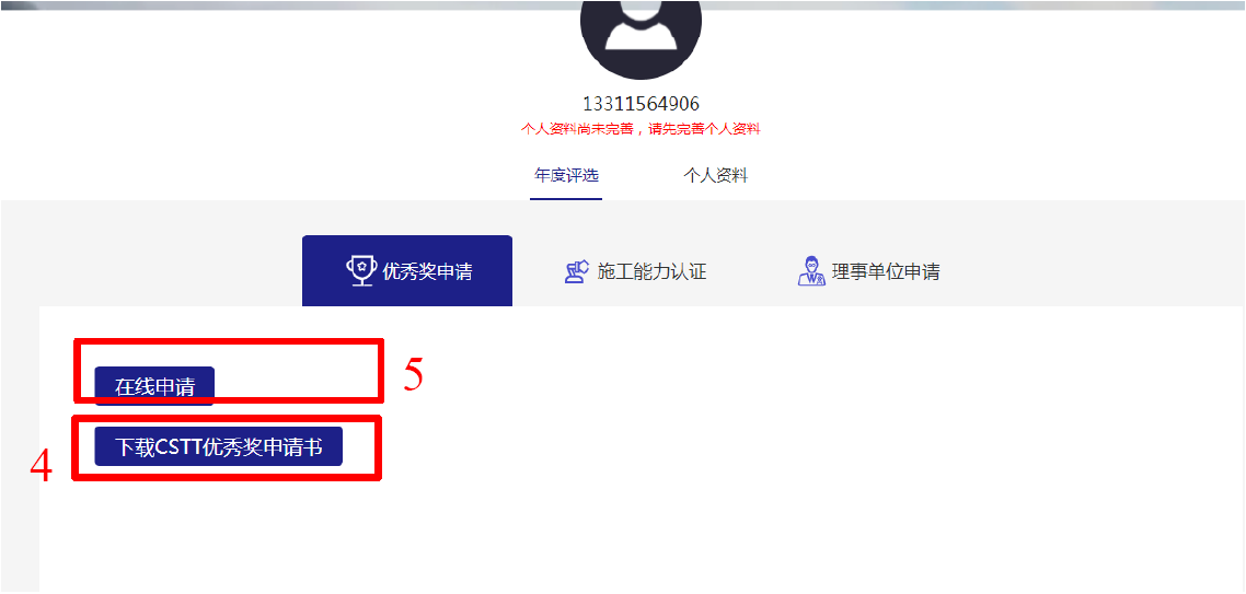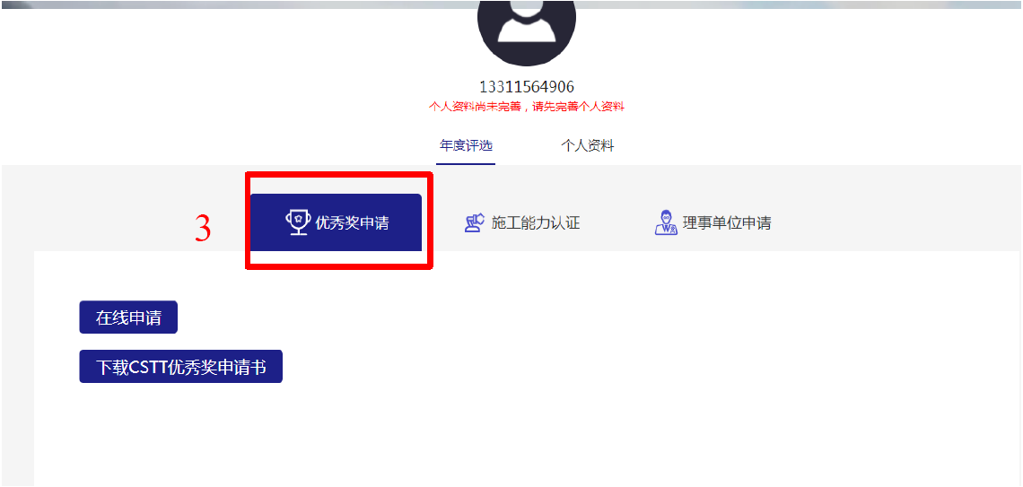 說明:個人會員賬號可以申請年度人物和專家;單位會員可以申請優秀獎和施工能力認證。